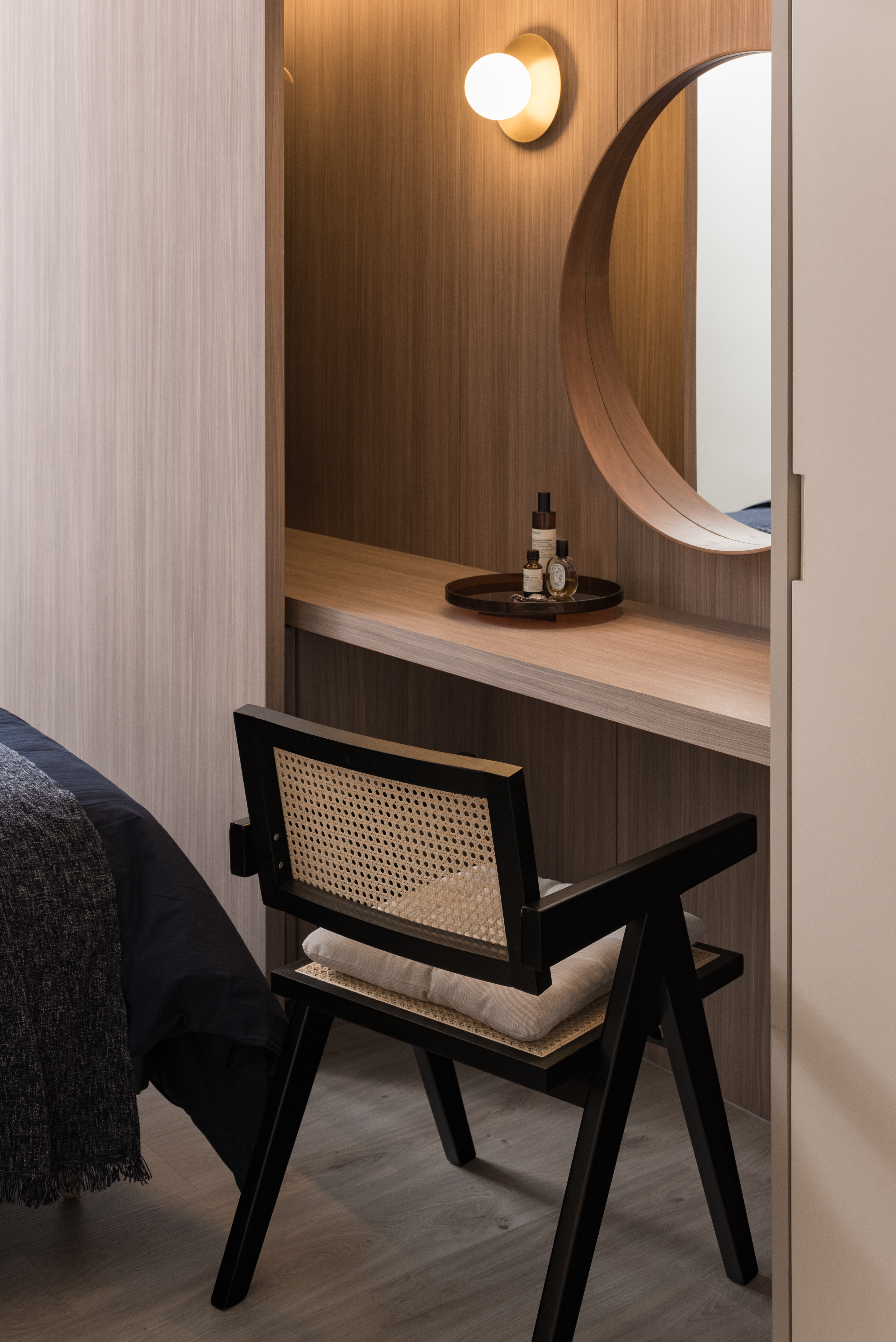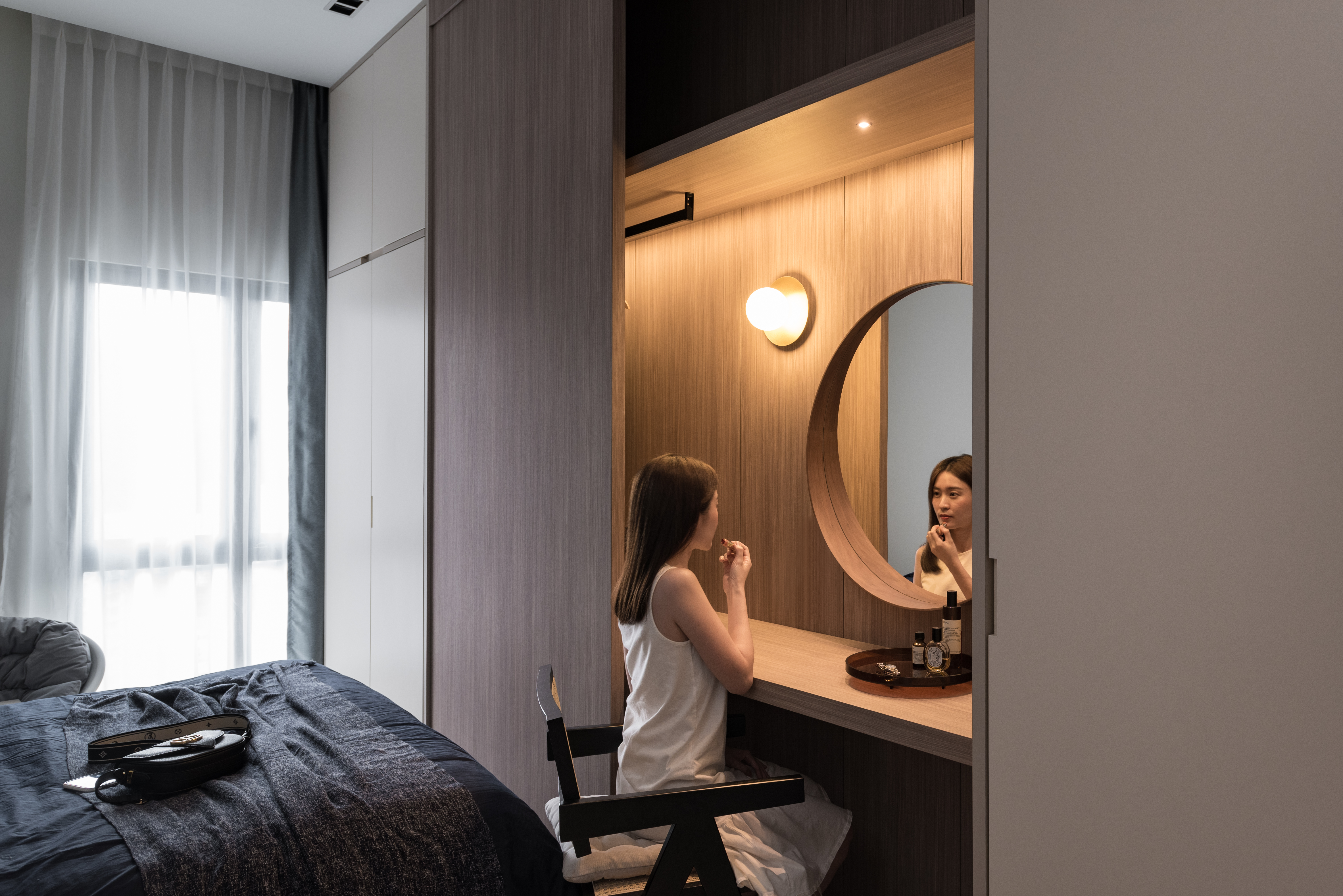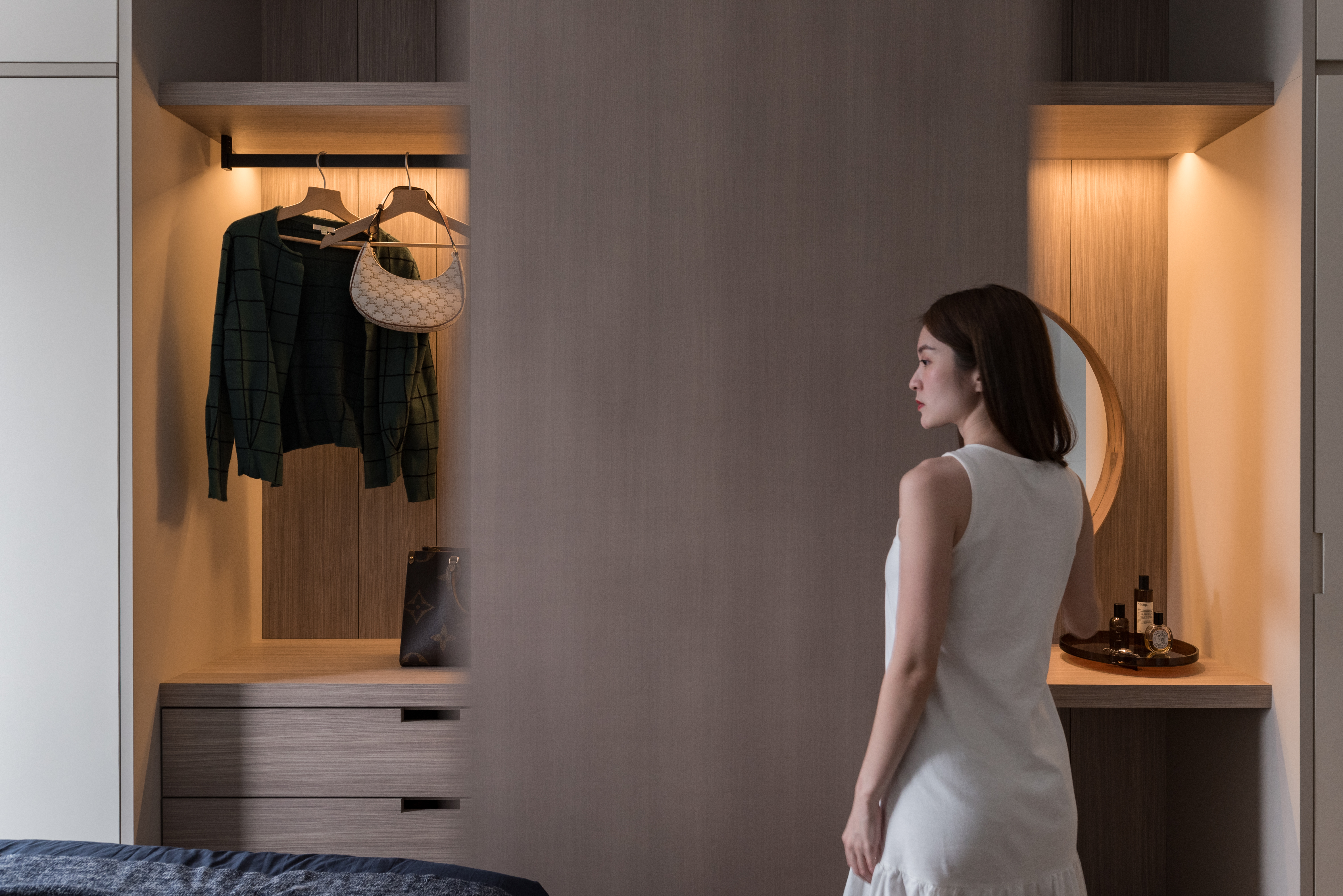 The dressing unit in master room was designed with a refined aesthetic to display the woodgrain at its maximum.