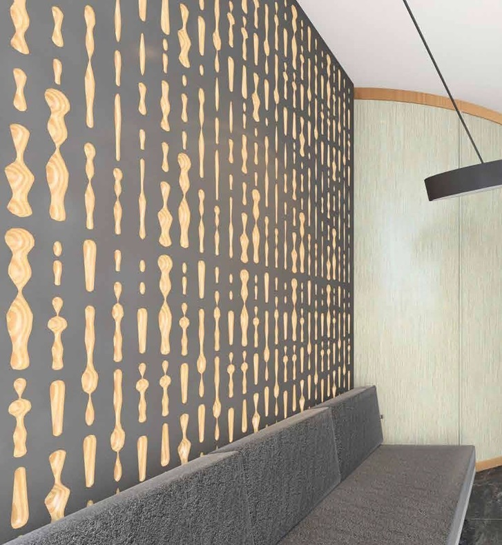 Highlight: We have used a unique CNC linear cut to create an artistic feature wall that reveals layers of plywood behind our laminate surface. By varying the engraving height during the machining process different widths and depths are created on a liner path hence creating a pattern like water droplet.
