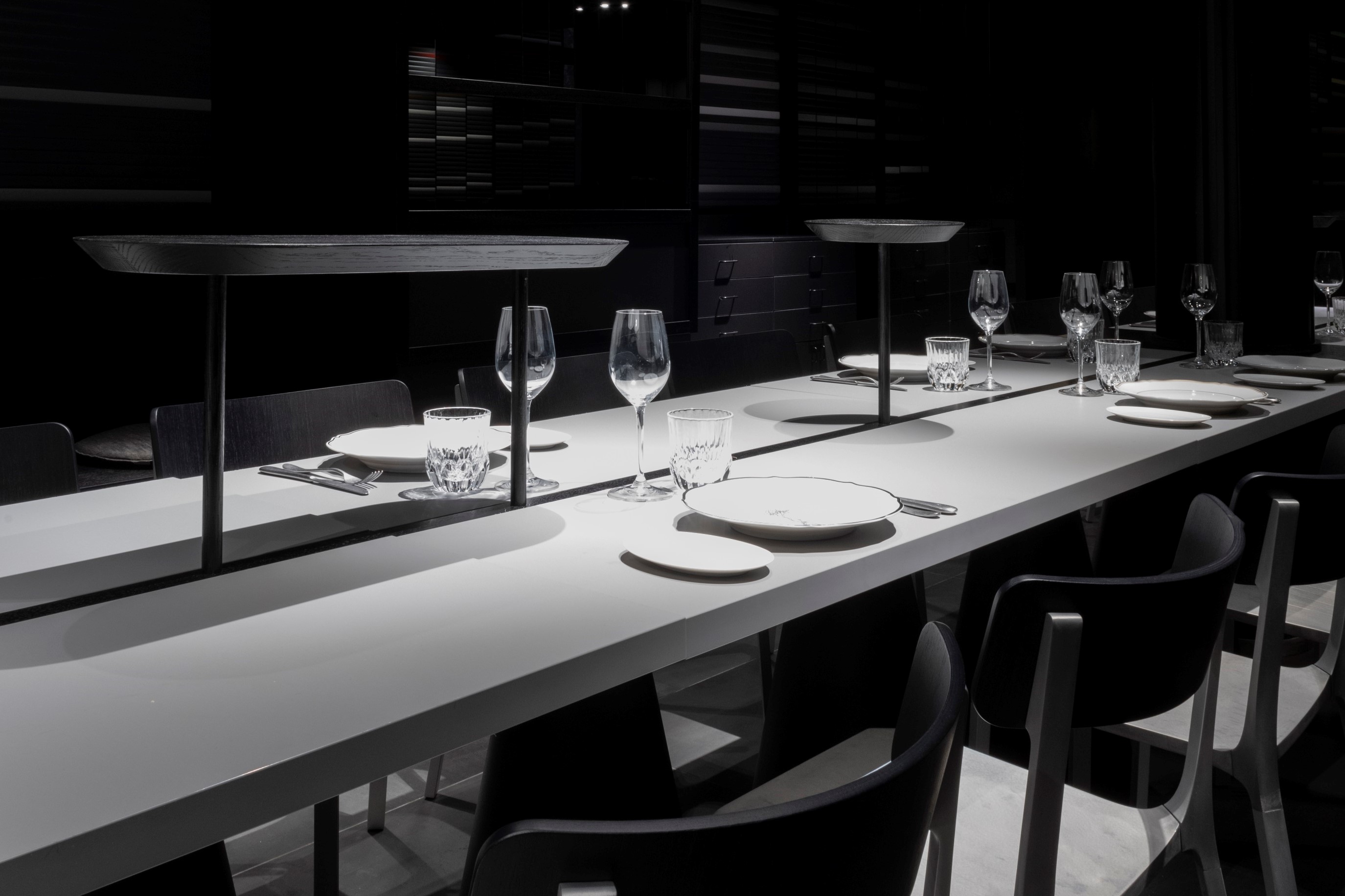 A long central table made from super-matte material, which immediately conveys the Carlo e Camilla’s concept, focused on sharing both the space and the dining experience. The table is characterised by its modularity, which allows for six different configurations. Divided by a delicate black oak spine, the 11-metre tabletop is characterised by the tactility of FENIX NTM® in Grigio Antrim. The material is super-matte, pleasant to the touch and anti-fingerprint.