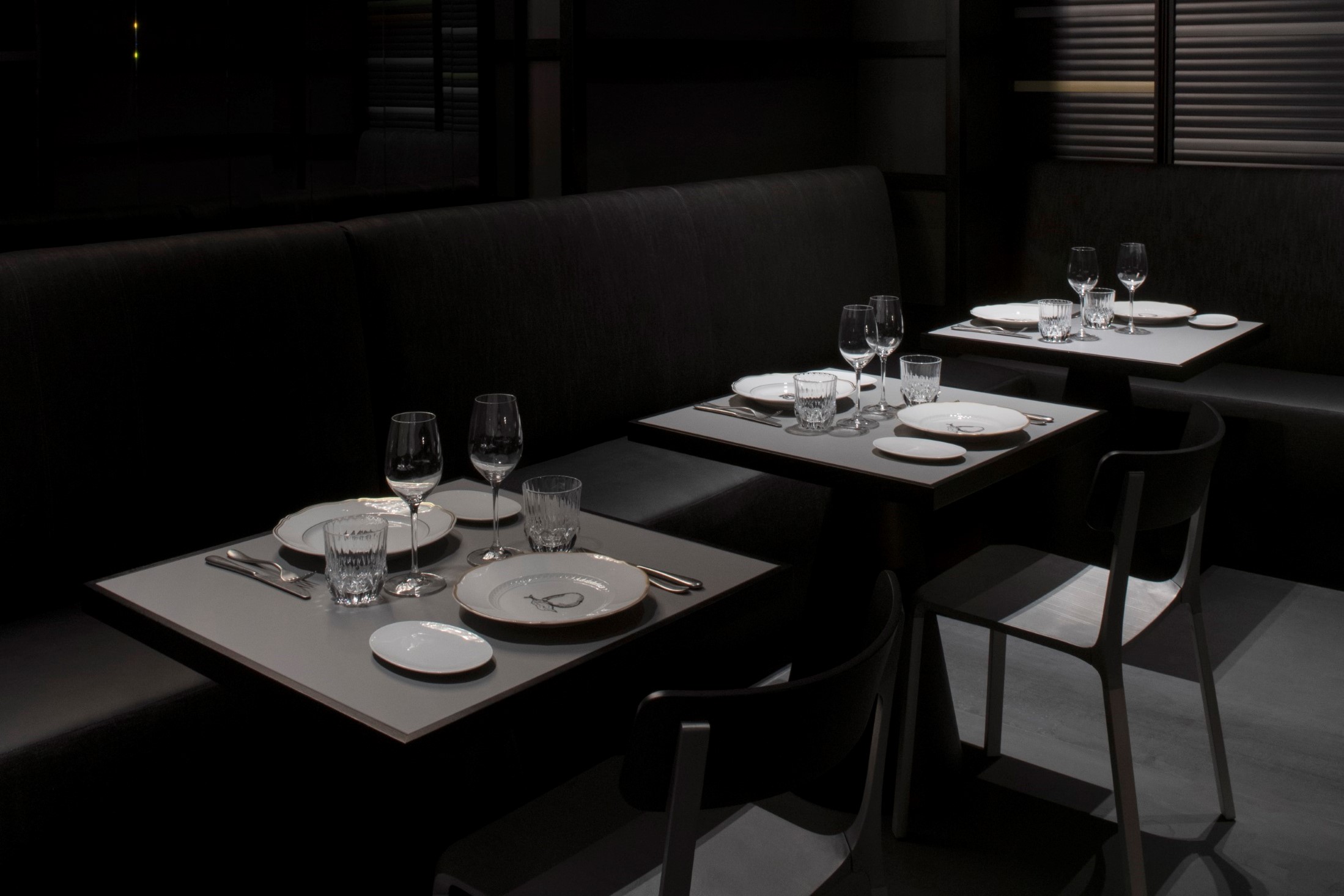 The tables made of FENIX are paired with bench seating upholstered with washed-effect black denim, whilst the chairs are made from specially unpainted aluminium, a conscious choice intended to lend the whole environment a non-conformist and one-of-a-kind vibe.
