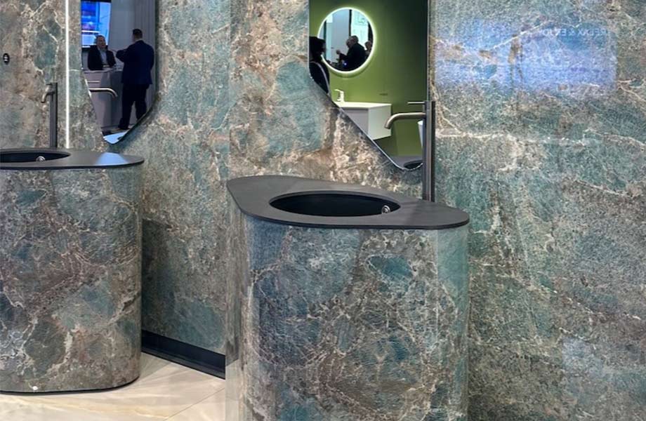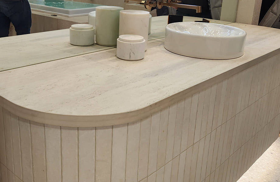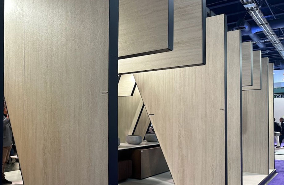 Diseños multifacéticos con sombras de beige, gris pardo, y marrón se mostraron en KBIS en una variedad de exhibiciones de piedra. El laminado 180fx® Hazelnut Travertine ejemplifica esta belleza clásica con corte de vena direccionada para un atractivo moderno.
