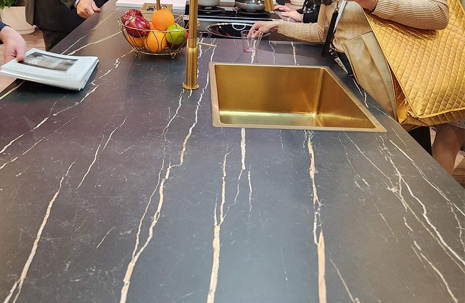El verde fue el color focal para muchos diseñadores en KBIS, y nosotros vimos un rango en tonos desde suaves y silenciados hasta brillantes y vibrantes. Para piedras naturales, esta es una continuación de tendencias vistas en la Semana del Diseño en Milan 2022, la cual comenzó con la creación del laminado 180fx® Jatoba Green.