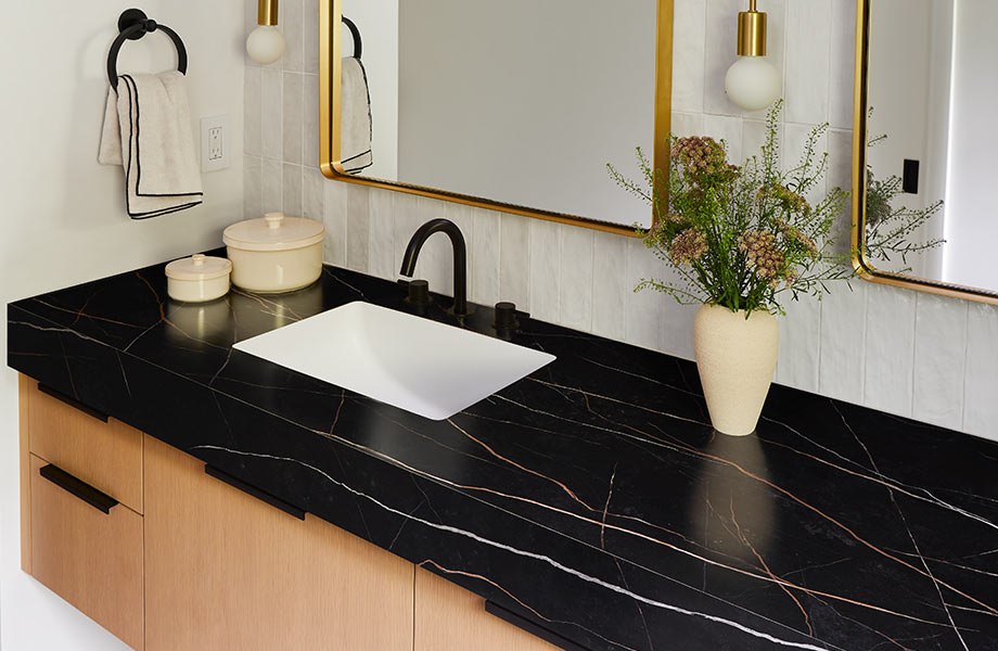 Muchas de las piedras llamativas mostraron vetas dramáticas en paredes, islas de cocinas y tocadores de baños. El cálido veteado continúa siendo popular pero ahora con colores mas fuertes como terracota. Nuestro laminado Sahara Noir 180fx® muestra este estilo a la perfección.