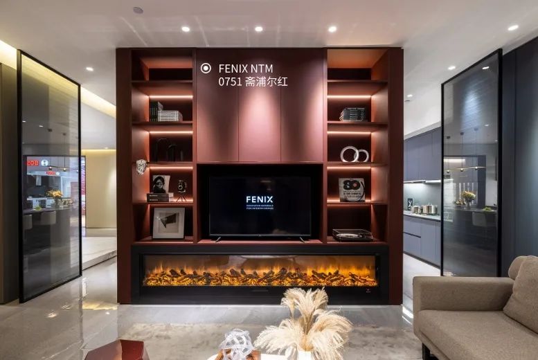 客厅空间由FENIX打造的电视柜和高柜组合呈现,搭配大沙发、茶几和落地灯,呈现温暖舒适的氛围。点缀的壁炉,将家的柔情与美好,凝聚成具象化的温度感知。