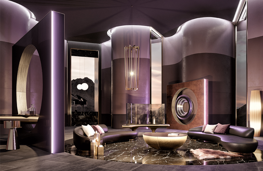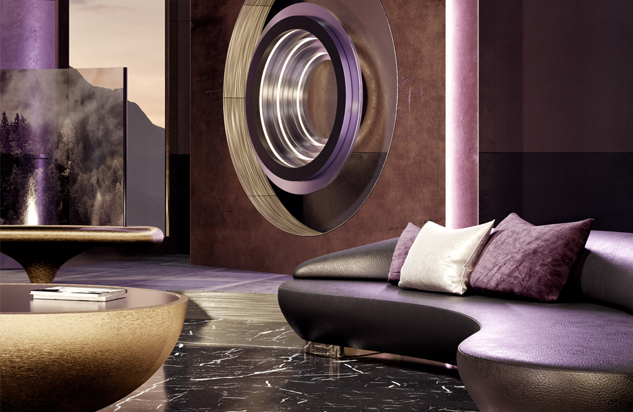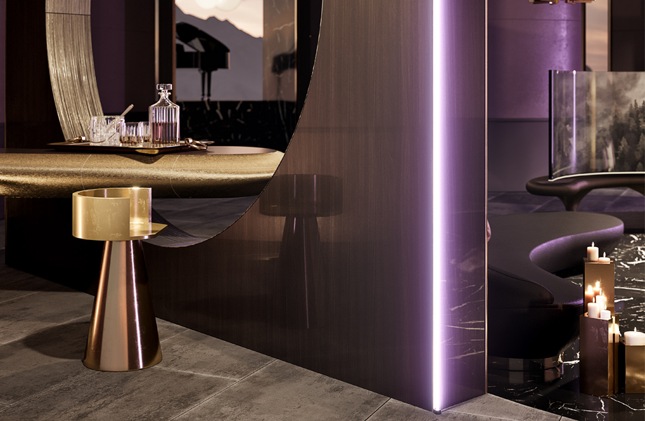 灵感来自于艺术和设计领域的新兴趋势,金属材料能为暗调空间增添一丝活力——搭配优雅的紫色,彰显空间的神秘气息。