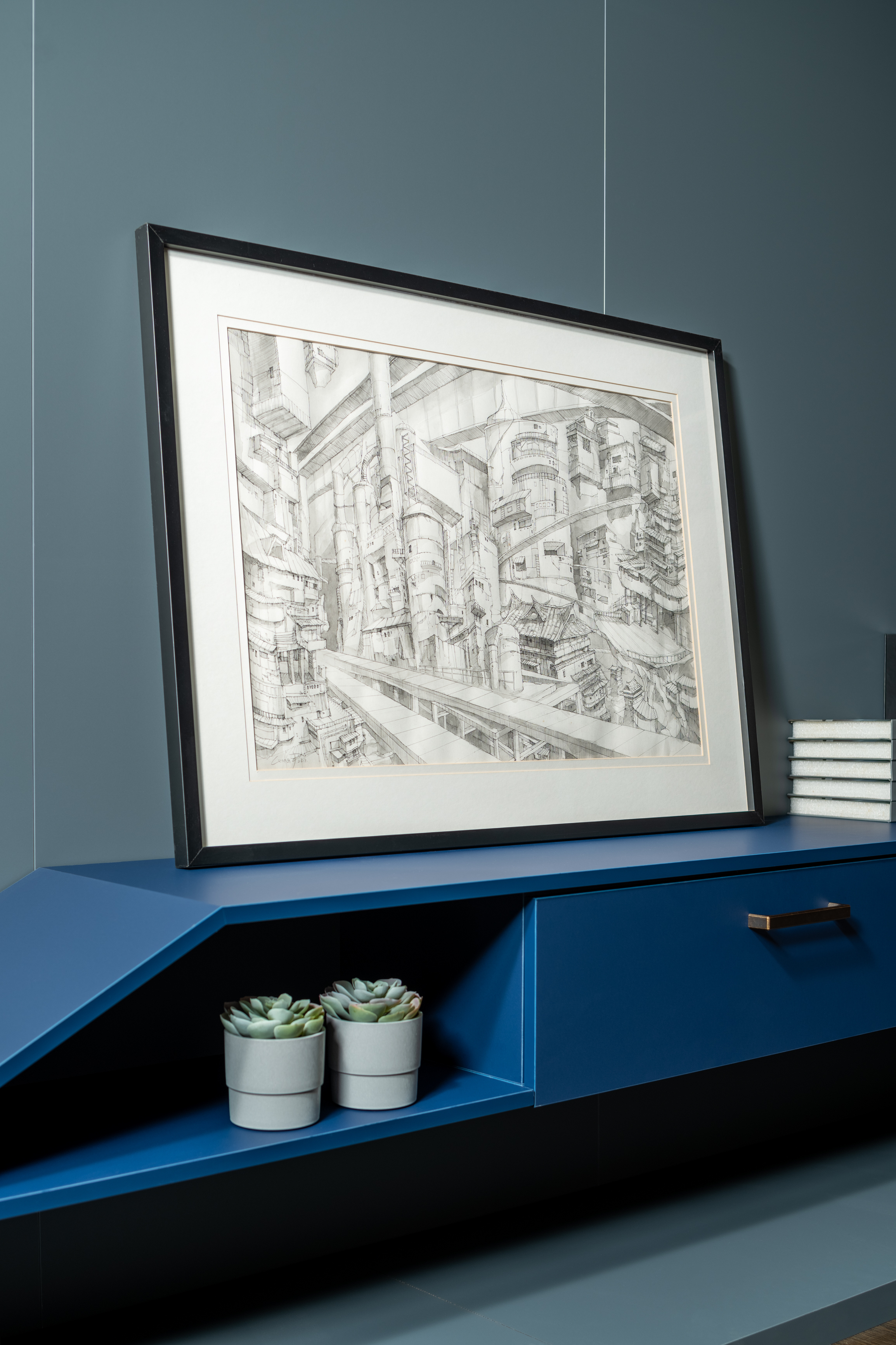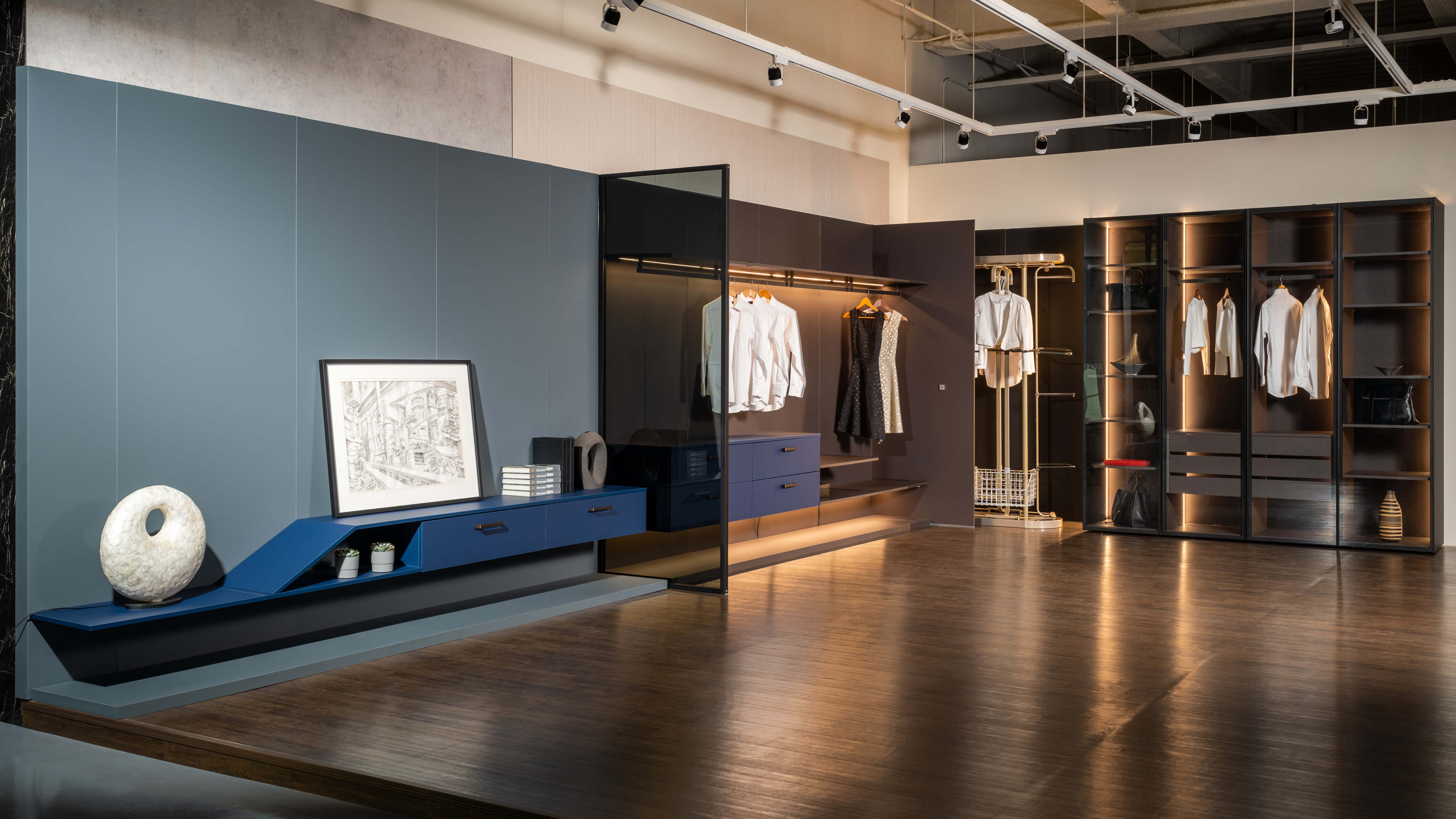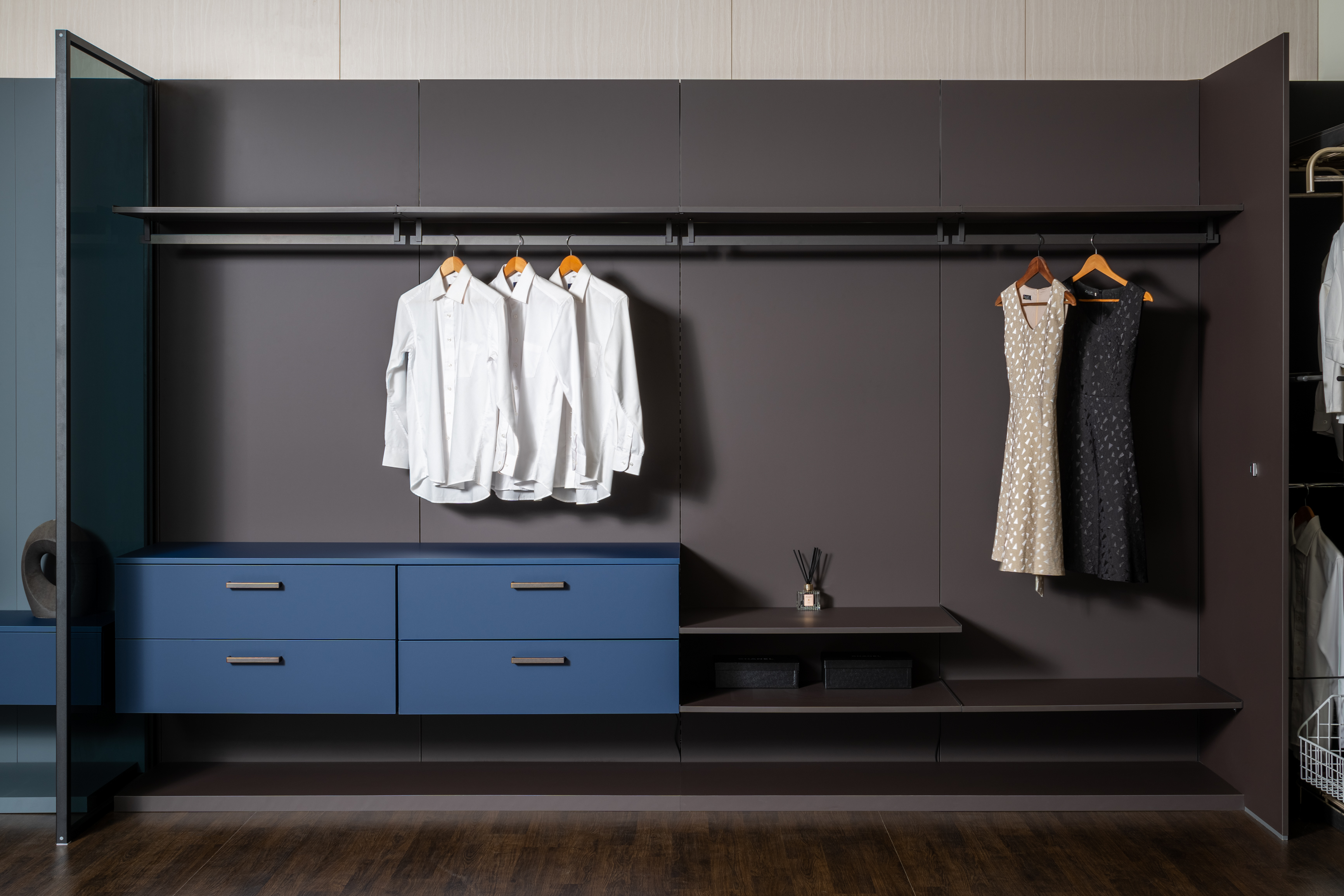 冷調霧藍的起居室,延伸至暖咖的衣帽間,相互對比,彼此輝映出獨具特色的居所。