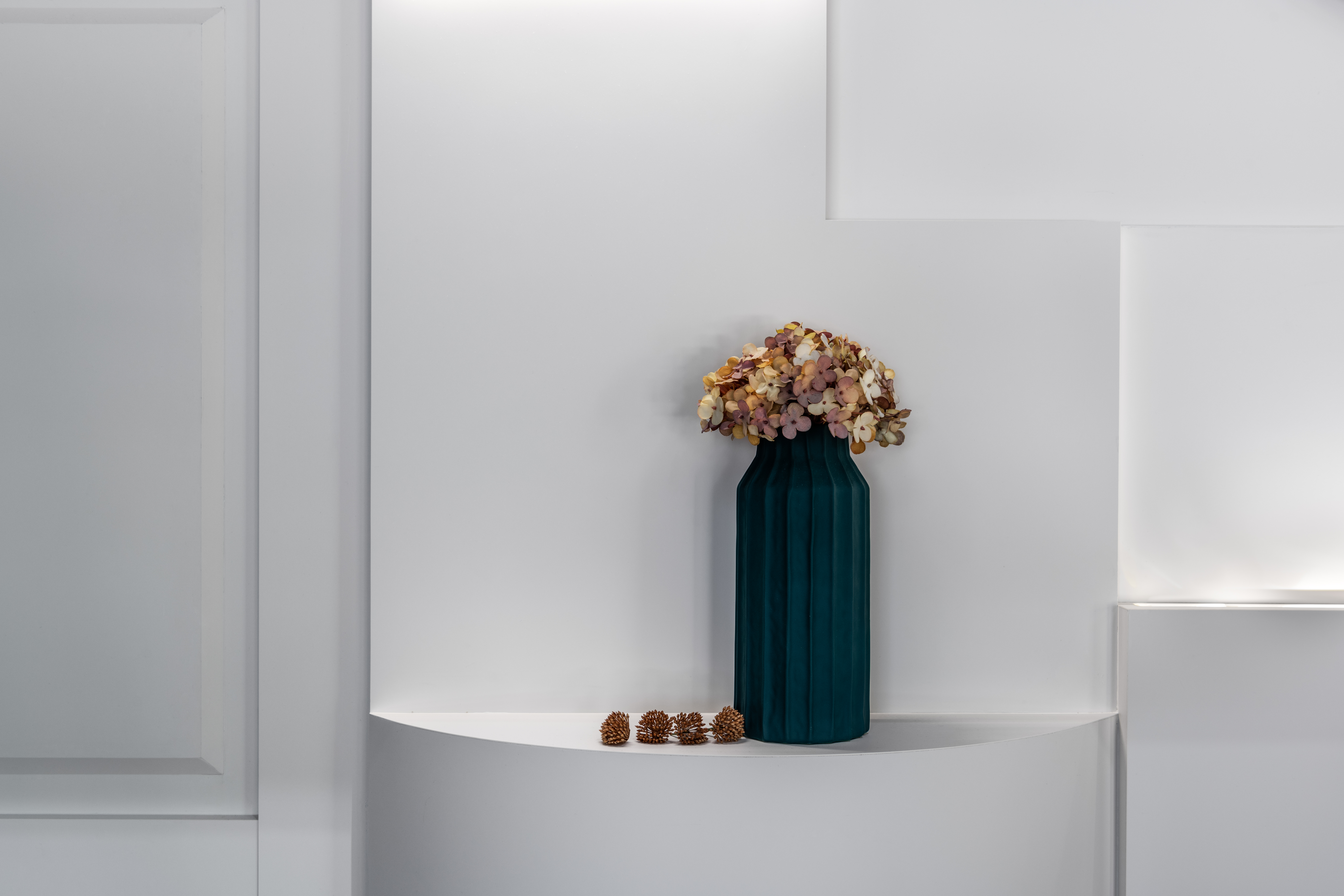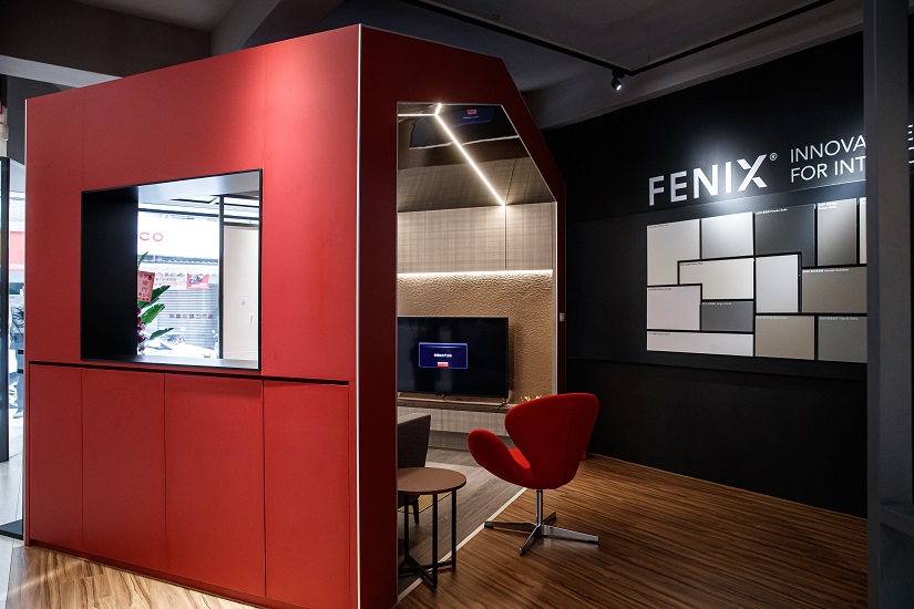 進入展示空間,FENIX®以精品櫥窗的方式呈現眼前。極致霧面、色澤低調且優雅,FENIX®可輕易營造出靜謐的氛圍。 作為精品櫥窗與展示牆,恰如其分的與藝術品相互呼應,讓現代美學在生活中展現獨特的生命力。 現場FENIX®如花般的造型與燈光搭配,展現板材獨特的低光線反射率及令人驚嘆的彎曲性,為裝飾板材帶來的更多可能。