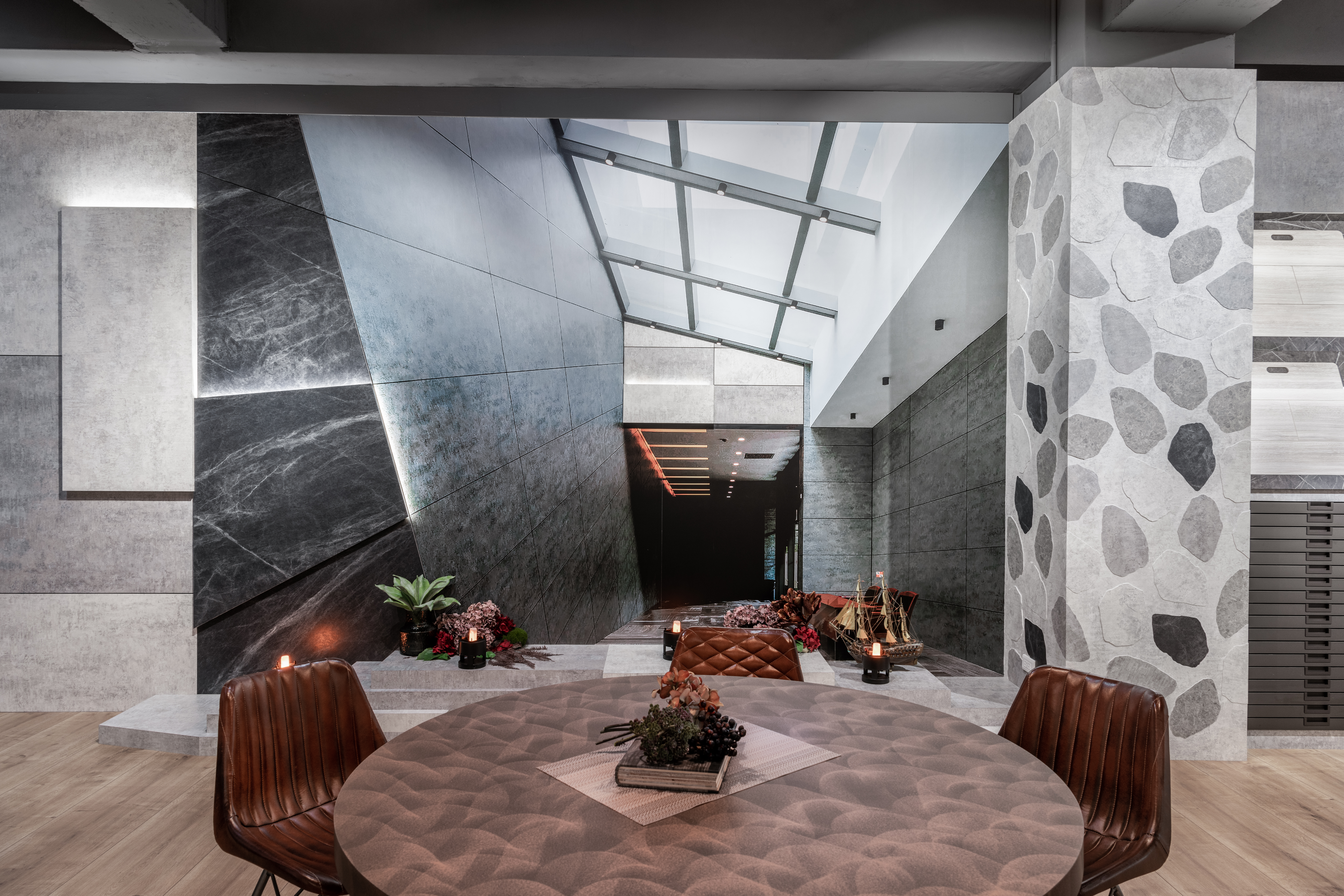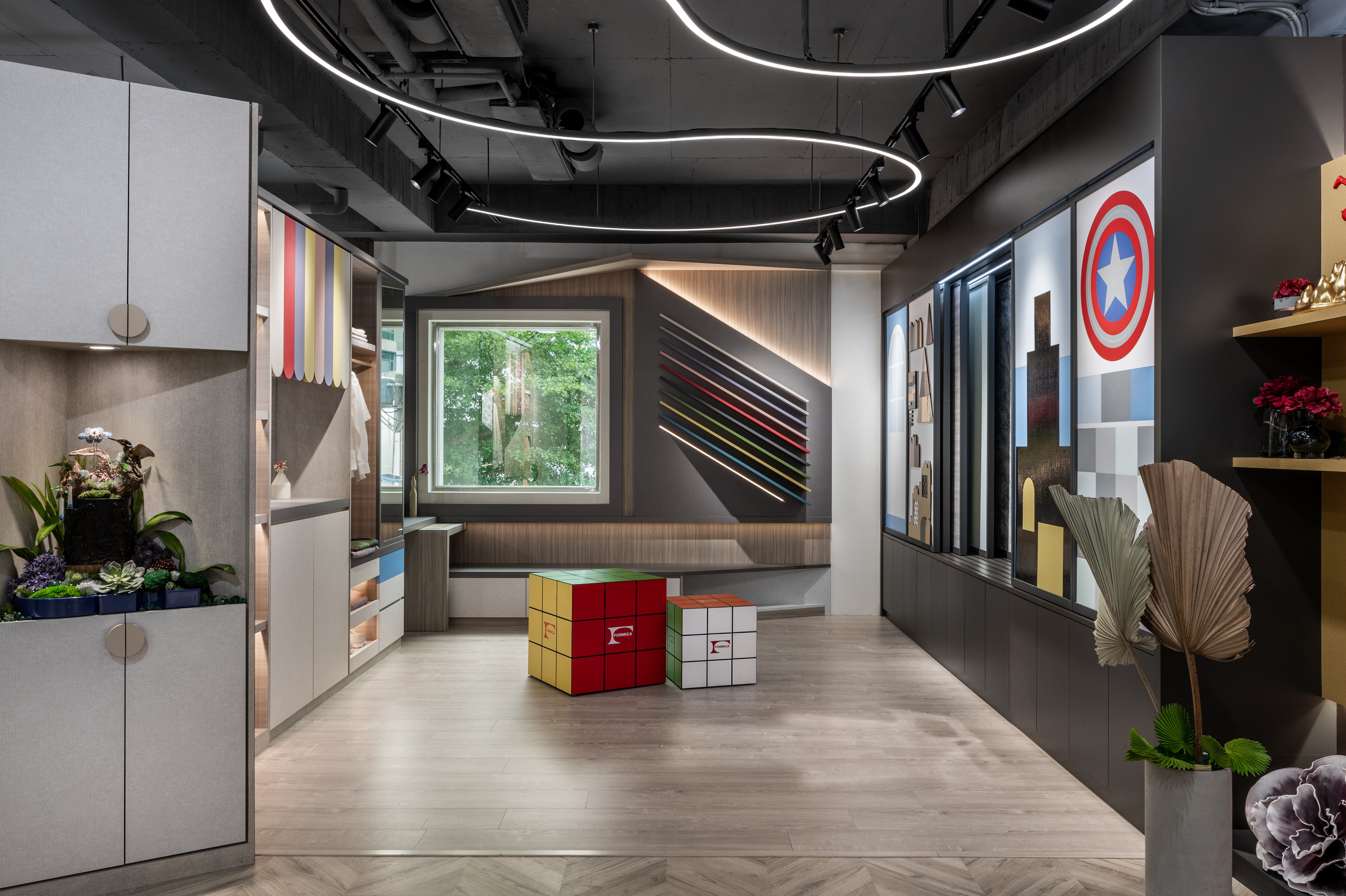 靈感旅程的最終站,將具備耐燃一級認證的富美家®火立克®+潔菌板運用虛實整合,以火焰暗喻板材特色。