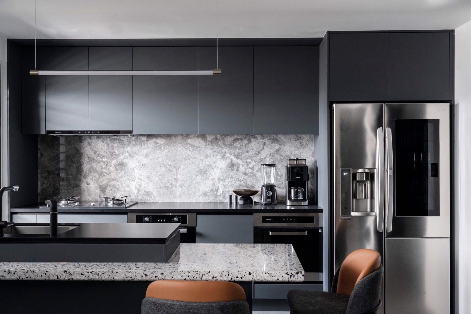 與客廳呼應的開放餐廚空間,以 FENIX®火山塵灰 鋪陳,在極致霧面的溫潤質地中,深沈質感應運而生;搭配灰白紋路的牆面與中島,再佐以一抹皮質餐椅,襯托都會時尚的極簡美學。
