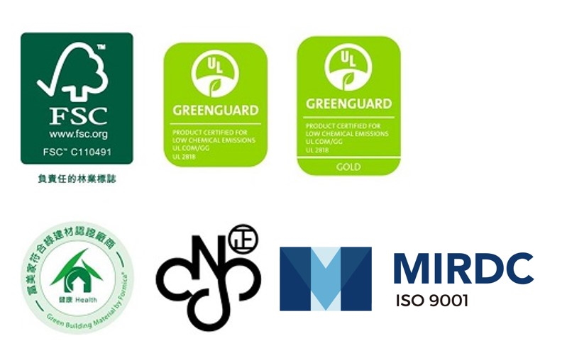 富美家®高級裝飾耐火板、抗倍特®、彩虹心®、金麗®金屬產品系列,已經在亞洲區取得由國際組織GEI(綠色防護環境組織)所核准的GREENGUARD(原稱室內空氣品質認證)及GREENGUARD Gold(原稱室內空氣品質認證 - 兒童與學校)兩項認證。GEI規範出室內用產品、室內空間及建築物之室內空氣品質標準,換言之取得此機構認證之產品,是符合室內空氣品質規範之國際標準的環保室內建材。